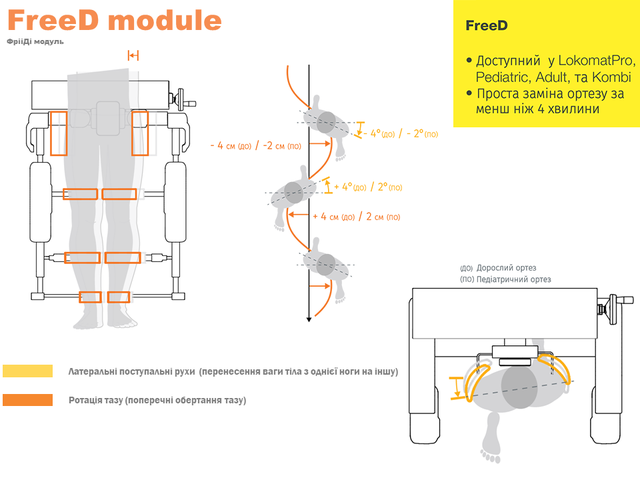 Модуль вільного переміщення тазу (FreeD) - це абсолютно нова і унікальна функція, яка дозволяє здійснювати вільні переміщення тазу пацієнта. Вона імітує бічні зміщення, повороти таза і фази перенесення ваги тіла пацієнта з однієї ноги на іншу для відтворення природної ходи. Модуль забезпечує кілька унікальних можливостей для тренування: ротація таза для активізації м'язів корпусу, перенесення ваги тіла з однієї ноги на іншу, відвід / приведення в тазостегнових суглобах.